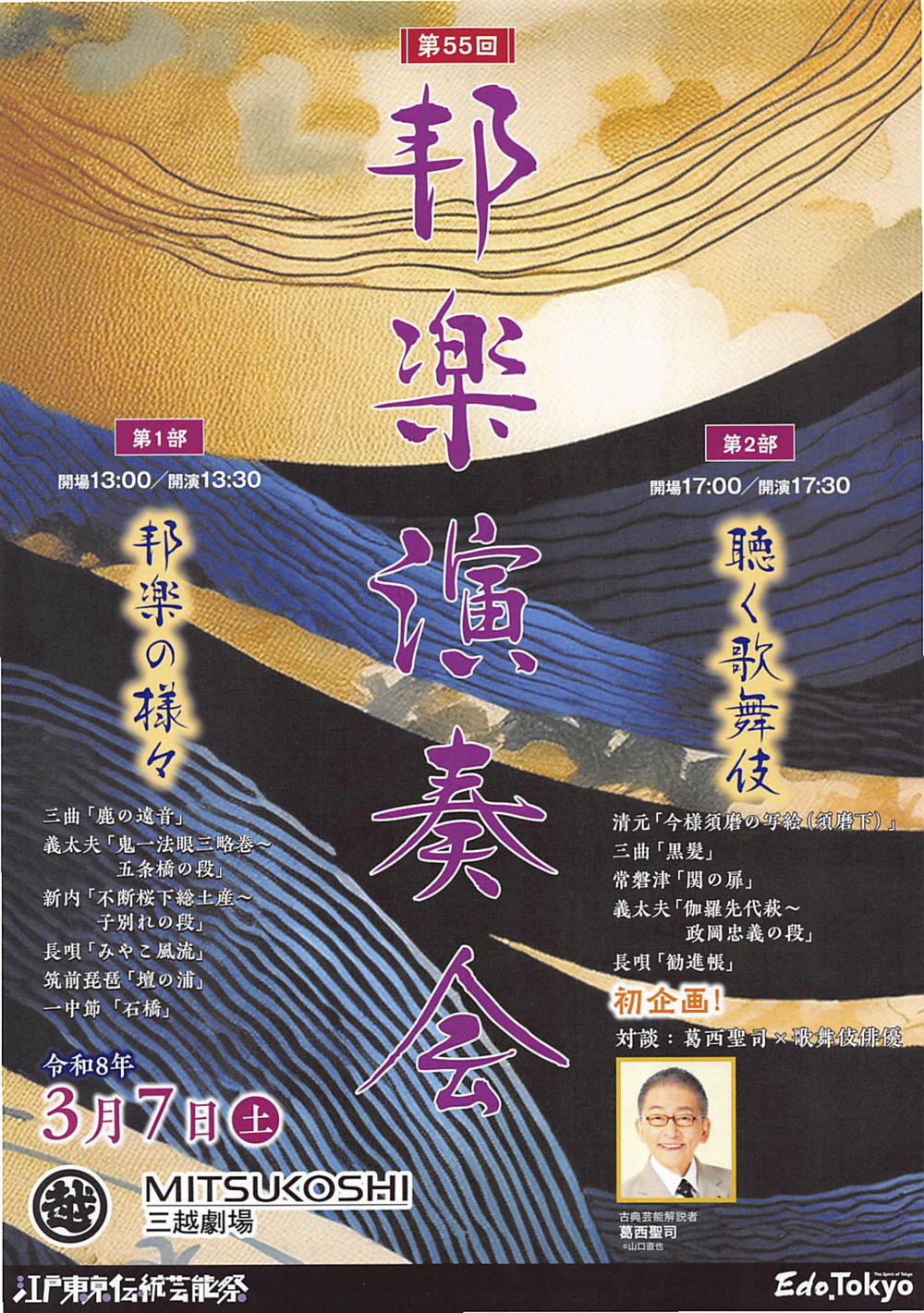 清元「今様須磨の写絵(須磨下)」 三曲「黒髪」 常磐津「関の扉」 対談 義太夫「伽羅先代萩 政岡忠義の段」 長唄「勧進帳」