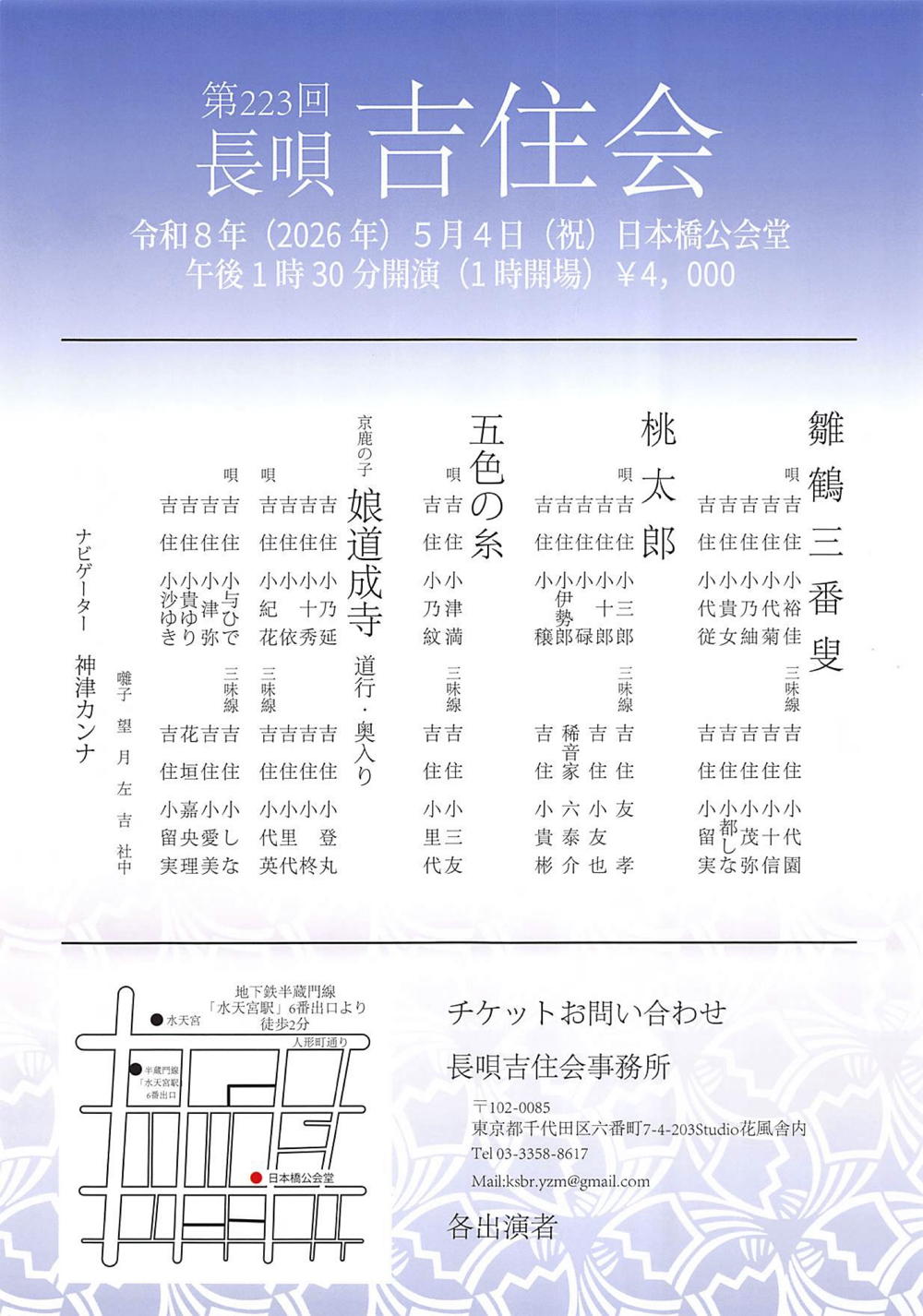 主催:長唄 吉住会 ksbr.yzm@gmail.com TEL:03−3358−8617